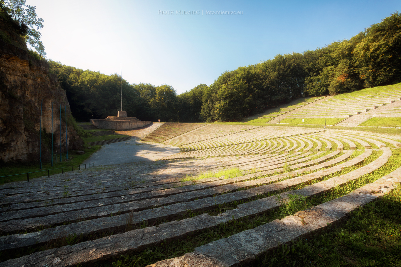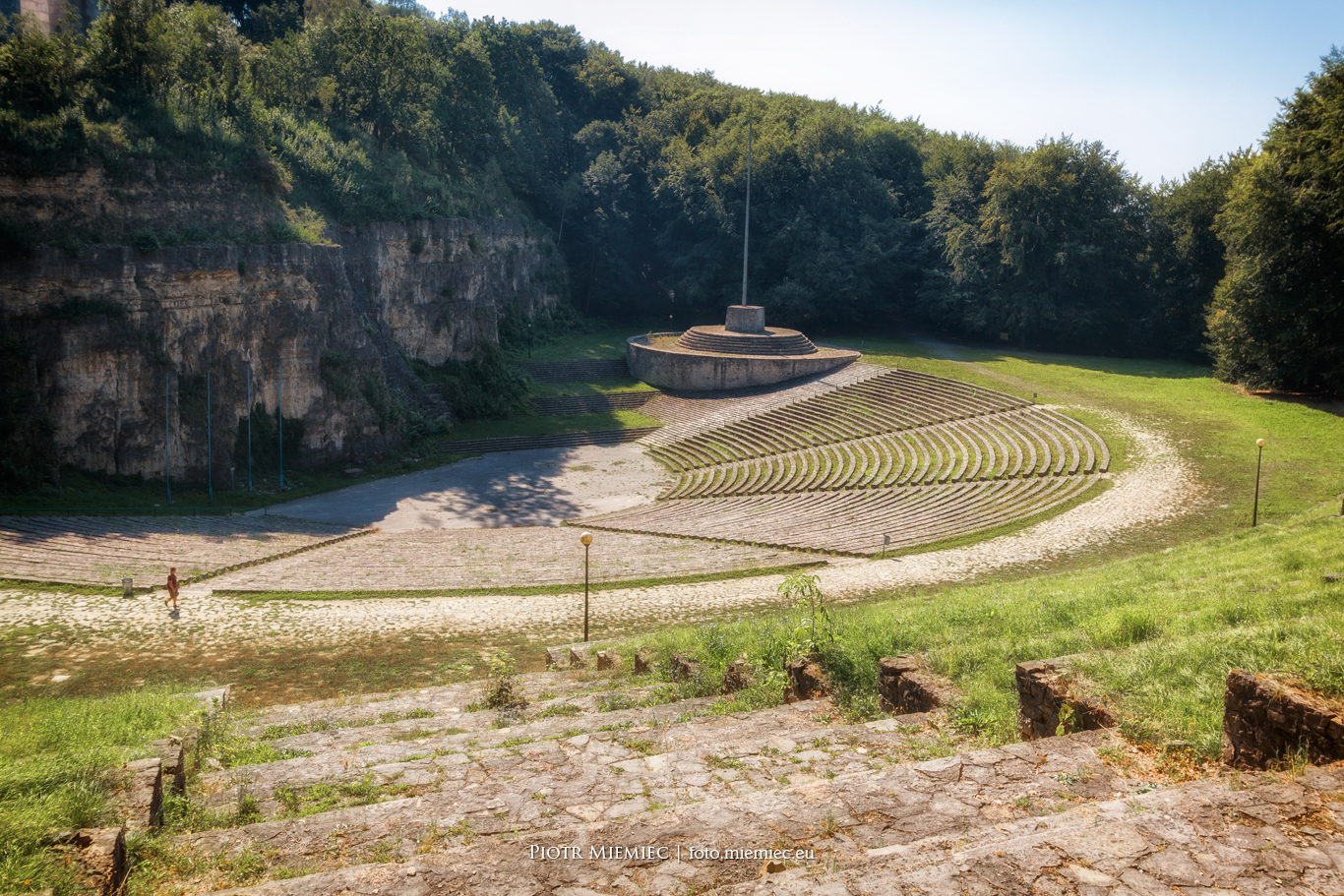 W miejscu dzisiejszego amfiteatru znajdował się kamieniołom o nazwie Kuhtal, z którego wydobywano wapienie. Wypalano je w stojących obok piecach, z których jeden przetrwał do dzisiaj. Produkcji wapienia zaprzestano po I wojnie światowej. W 1934 r. właścicielka tego terenu, hrabina von Francken-Sierstorpff z Żyrowej, prawdopodobnie musiała przekazać dawny kamieniołom nowym władzom niemieckim, które postanowiły przebudować to miejsce na amfiteatr. Budowę, której architektami byli Franz Böhmer i Georg Petrich z Berlina, ukończono w 1938 roku. W tym czasie obiekt miał 7 tys. miejsc siedzących i 20 tys. stojących. Wykorzystując przestrzeń między sektorami oraz w przejściach mógł pomieścić nawet 50 tyś osób.