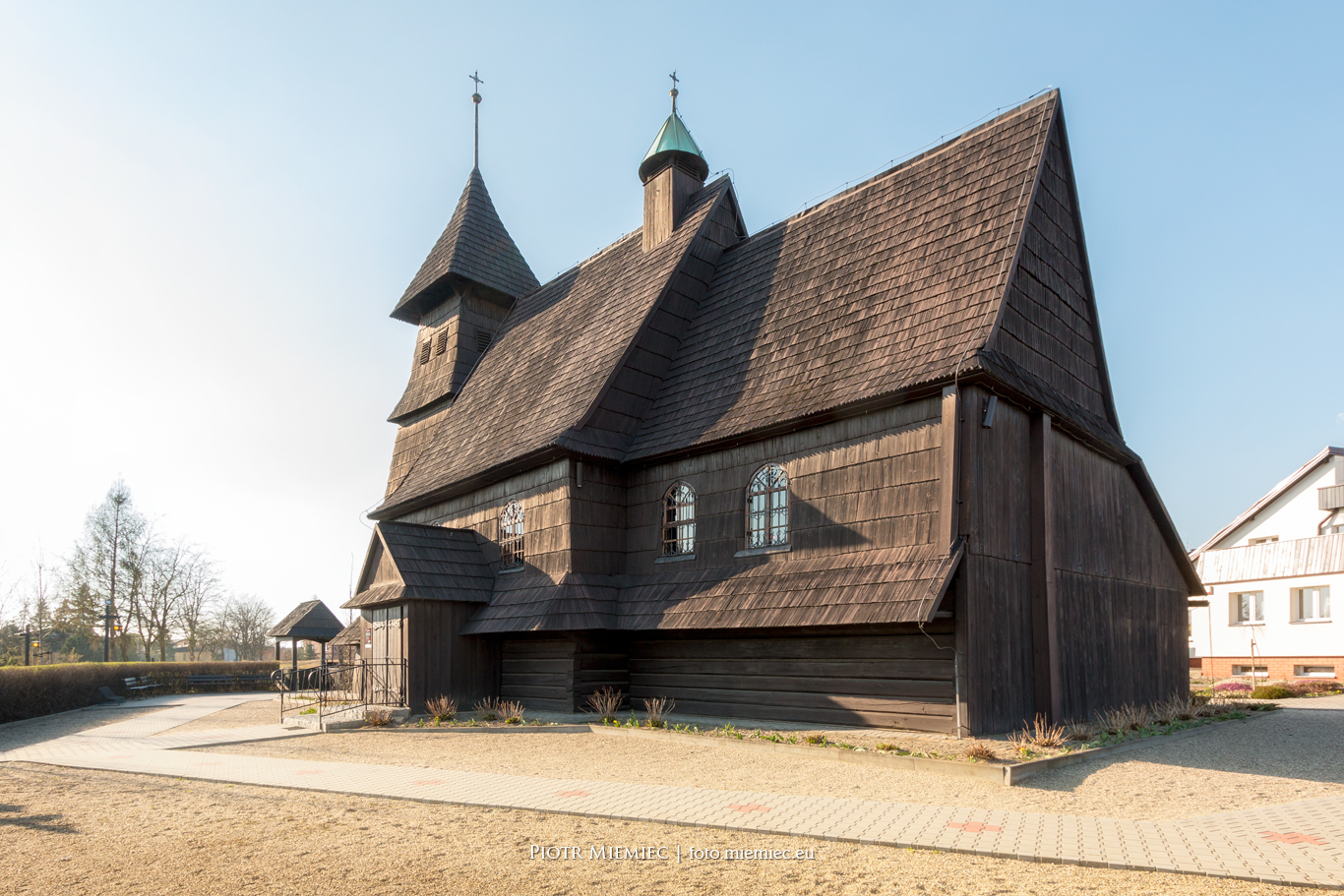 Kościół drewniany jako budowla, składa się z wieży pod którą znajduje się przedsionek zwany kruchtą, środkowego korpusu czyli nawy, oraz prezbiterium przy którym znajduje się zakrystia. Nad kruchtą lub w przedniej górnej części nawy mieści się zwykle chór muzyczny.